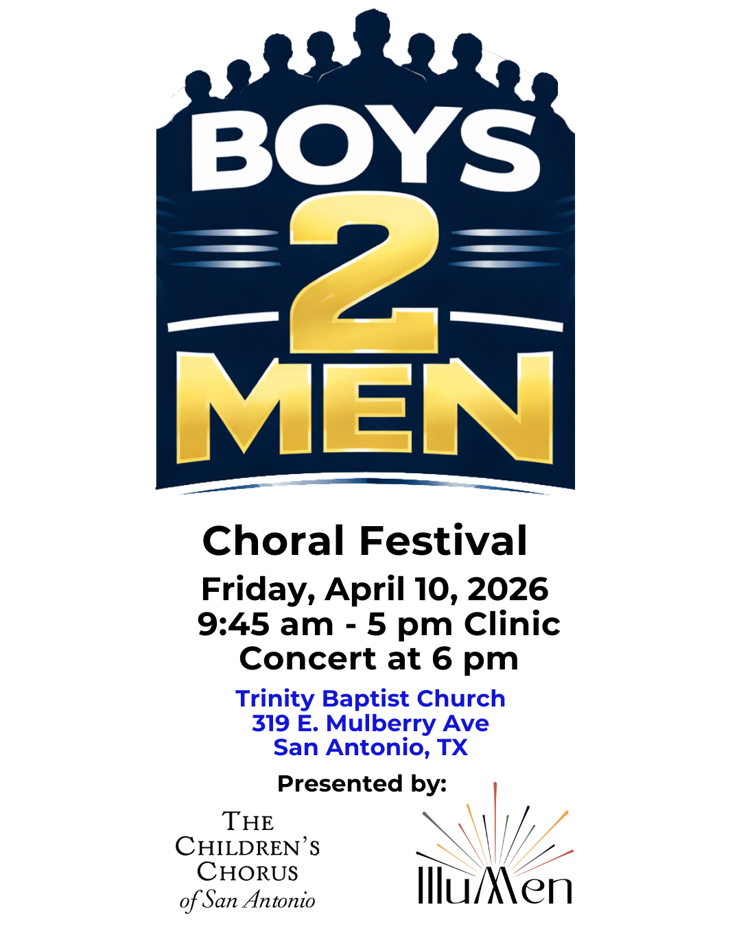 Boys 2 Men 2026 is a dynamic, day-long choral festival sponsored by the Children’s Chorus of San Antonio (CCSA) and IlluMen, especially designed for middle and high school male singers across San Antonio. Participants will rehearse and perform three combined selections alongside special guest artists and clinicians: Dr. Jordan Boyd from UTSA, Members of IlluMen, Dr. Carolyn Cruse from CCSA, and Mr. Gabriel Treviño from Johnson High School and CCSA. Join us to celebrate male choral singing, strengthen your program, and build positive peer connections through leadership and mentorship with fellow singers and professional musicians!